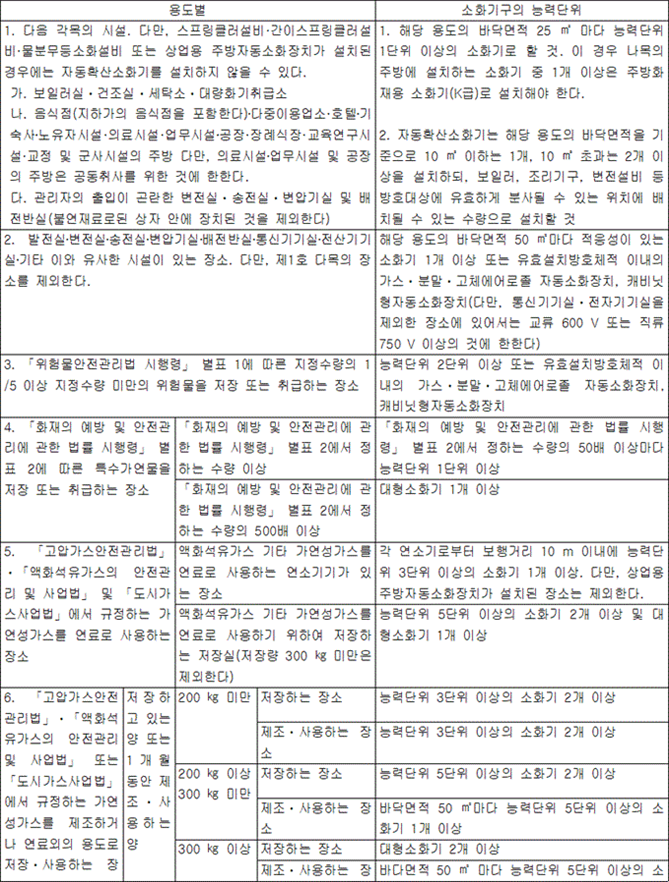 - 3. 제2호에 따른 능력단위 외에 부속용도별로 사용되는 부분에 대하여는 소화기구 및 자동소화장치를 추가하여 설치할 것