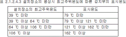 2.1.2.4.3 감지부는 형식승인 된 유효설치범위 내에 설치해야 하며 설치장소의 평상시 최고주위온도에 따라 다음 표 2.1.2.4.3에 따른 표시온도의 것으로 설치할 것. 다만, 열감지선의 감지부는 형식승인 받은 최고주위온도범위 내에 설치해야 한다.