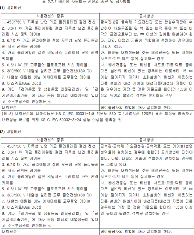② 제1항에 따른 내화배선 및 내열배선에 사용되는 전선은 내화전선으로 하고, 설치방법은 적합한 케이블공사의 방법에 따른다.