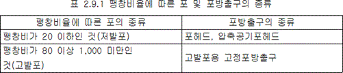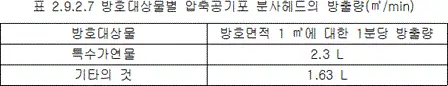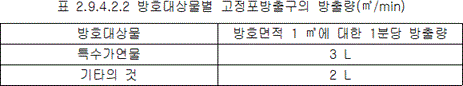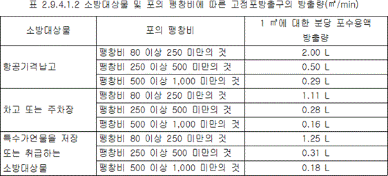 2.9.3 차고·주차장에 설치하는 호스릴포소화설비 또는 포소화전설비는 다음의 기준에 따라야 한다. 2.9.3.1 특정소방대상물의 어느 층에 있어서도 그 층에 설치된 호스릴포방수구 또는 포소화전방수구(호스릴포방수구 또는 포소화전방수구가 5개 이상 설치된 경우에는 5개)를 동시에 사용할 경우 각 이동식 포노즐 선단의 포수용액 방사압력이 0.35 ㎫ 이상이고 300 L/min 이상(1개 층의 바닥면적이 200 ㎡ 이하인 경우에는 230 L/min 이상)의 포수용액을 수평거리 15 m 이상으로 방사할 수 있도록 할 것 2.9.3.2 저발포의 포소화약제를 사용할 수 있는 것으로 할 것 2.9.3.3 호스릴 또는 호스를 호스릴포방수구 또는 포소화전방수구로 분리하여 비치하는 때에는 그로부터 3 m 이내의 거리에 호스릴함 또는 호스함을 설치할 것 2.9.3.4 호스릴함 또는 호스함은 바닥으로부터 높이 1.5 m 이하의 위치에 설치하고 그 표면에는 "포호스릴함(또는 포소화전함)"이라고 표시한 표지와 적색의 위치표시등을 설치할 것 2.9.3.5 방호대상물의 각 부분으로부터 하나의 호스릴포방수구까지의 수평거리는 15 m 이하(포소화전방수구의 경우에는 25 m 이하)가 되도록 하고 호스릴 또는 호스의 길이는 방호대상물의 각 부분에 포가 유효하게 뿌려질 수 있도록 할 것 2.9.4 고발포용포방출구는 다음의 기준에 따라 설치해야 한다. 2.9.4.1 전역방출방식의 고발포용 고정포방출구는 다음의 기준에 따를 것 2.9.4.1.1 개구부에 자동폐쇄장치(「건축법 시행령」 제64조제1항에 따른 방화문 또는 불연재료로 된 문으로 포수용액이 방출되기 직전에 개구부가 자동적으로 폐쇄될 수 있는 장치를 말한다)를 설치할 것. 다만, 해당 방호구역에서 외부로 새는 양 이상의 포수용액을 유효하게 추가하여 방출하는 설비가 있는 경우에는 그렇지 않다. 2.9.4.1.2 고정포방출구(포발생기가 분리되어 있는 것은 해당 포발생기를 포함한다)는 특정소방대상물 및 포의 팽창비에 따른 종별에 따라 해당 방호구역의 관포체적(해당 바닥 면으로부터 방호대상물의 높이보다 0.5 m 높은 위치까지의 체적을 말한다) 1 ㎥에 대하여 1분당 방출량이 다음 표 2.9.4.1.2에 따른 양 이상이 되도록 할 것