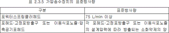 2.3.6 가압수조를 이용한 가압송수장치는 다음의 기준에 따라 설치해야 한다. 2.3.6.1 가압수조의 압력은 2.3.5에 따른 방사량 및 방사압이 20분 이상 유지되도록 할 것 2.3.6.2 가압수조 및 가압원은 「건축법 시행령」 제46조에 따른 방화구획 된 장소에 설치할 것 2.3.6.3 가압수조를 이용한 가압송수장치는 소방청장이 정하여 고시한 「가압수조식가압송수장치의 성능인증 및 제품검사의 기술기준」에 적합한 것으로 설치할 것 2.4 배관 등 2.4.1 배관과 배관이음쇠는 다음의 어느 하나에 해당하는 것 또는 동등 이상의 강도·내식성 및 내열성 등을 국내·외 공인기관으로부터 인정받은 것을 사용해야 하고, 배관용 스테인리스 강관(KS D 3576)의 이음을 용접으로 할 경우에는 텅스텐 불활성 가스 아크 용접(Tungsten Inertgas Arc Welding)방식에 따른다. 다만, 2.4에서 정하지 않은 사항은 「건설기술 진흥법」 제44조제1항의 규정에 따른 "건설기준"에 따른다. 2.4.1.1 배관 내 사용압력이 1.2 ㎫ 미만일 경우에는 다음의 어느 하나에 해당하는 것 (1) 배관용 탄소 강관(KS D 3507) (2) 이음매 없는 구리 및 구리합금관(KS D 5301). 다만, 습식의 배관에 한한다. (3) 배관용 스테인리스 강관(KS D 3576) 또는 일반배관용 스테인리스 강관(KS D 3595) (4) 덕타일 주철관(KS D 4311) 2.4.1.2 배관 내 사용압력이 1.2 ㎫ 이상일 경우에는 다음의 어느 하나에 해당하는 것 (1) 압력 배관용 탄소 강관(KS D 3562) (2) 배관용 아크용접 탄소강 강관(KS D 3583) 2.4.2 2.3.1에도 불구하고 다음의 어느 하나에 해당하는 장소에는 소방청장이 정하여 고시한 「소방용합성수지배관의 성능인증 및 제품검사의 기술기준」에 적합한 소방용 합성수지배관으로 설치할 수 있다. 2.4.2.1 배관을 지하에 매설하는 경우 2.4.2.2 다른 부분과 내화구조로 구획된 덕트 또는 피트의 내부에 설치하는 경우 2.4.2.3 천장(상층이 있는 경우에는 상층바닥의 하단을 포함한다. 이하 같다)과 반자를 불연재료 또는 준불연 재료로 설치하고 소화배관 내부에 항상 소화수가 채워진 상태로 설치하는 경우 2.4.3 송액관은 포의 방출 종료 후 배관 안의 액을 배출하기 위하여 적당한 기울기를 유지하도록 하고 그 낮은 부분에 배액밸브를 설치해야 한다. 2.4.4 포워터스프링클러설비 또는 포헤드설비의 가지배관의 배열은 토너먼트방식이 아니어야 하며, 교차배관에서 분기하는 지점을 기점으로 한쪽 가지배관에 설치하는 헤드의 수는 8개 이하로 한다. 2.4.5 송액관은 전용으로 해야 한다. 다만, 포소화전의 기동장치의 조작과 동시에 다른 설비의 용도에 사용하는 배관의 송수를 차단할 수 있거나, 포소화설비의 성능에 지장이 없는 경우에는 다른 설비와 겸용할 수 있다. 2.4.6 펌프의 흡입 측 배관은 다음의 기준에 따라 설치해야 한다. 2.4.6.1 공기 고임이 생기지 않는 구조로 하고 여과장치를 설치할 것 2.4.6.2 수조가 펌프보다 낮게 설치된 경우에는 각 펌프(충압펌프를 포함한다)마다 수조로부터 별도로 설치할 것 2.4.7 <삭제 2024.7.1.> 2.4.8 펌프의 성능시험배관은 다음의 기준에 적합하도록 설치해야 한다. 2.4.8.1 성능시험배관은 펌프의 토출 측에 설치된 개폐밸브 이전에서 분기하여 직선으로 설치하고, 유량측정장치를 기준으로 전단 직관부에는 개폐밸브를 후단 직관부에는 유량조절밸브를 설치할 것. 이 경우 개폐밸브와 유량측정장치 사이의 직관부 거리 및 유량측정장치와 유량조절밸브 사이의 직관부 거리는 해당 유량측정장치 제조사의 설치사양에 따르고, 성능시험배관의 호칭지름은 유량측정장치의 호칭지름에 따른다. 2.4.8.2 유량측정장치는 펌프의 정격토출량의 175 % 이상 측정할 수 있는 성능이 있을 것 2.4.9 가압송수장치의 체절운전 시 수온의 상승을 방지하기 위하여 체크밸브와 펌프 사이에서 분기한 구경 20 ㎜ 이상의 배관에 체절압력 미만에서 개방되는 릴리프밸브를 설치할 것 2.4.10 배관은 동결방지조치를 하거나 동결의 우려가 없는 장소에 설치해야 한다. 다만, 보온재를 사용할 경우에는 난연재료 성능 이상의 것으로 해야 한다. 2.4.11 급수배관에 설치되어 급수를 차단할 수 있는 개폐밸브(포헤드·고정포방출구 또는 이동식 포노즐은 제외한다)는 개폐표시형으로 해야 한다. 이 경우 펌프의 흡입측배관에는 버터플라이밸브 외의 개폐표시형밸브를 설치해야 한다. 2.4.12 2.4.11에 따른 개폐밸브에는 그 밸브의 개폐상태를 감시제어반에서 확인할 수 있도록 급수개폐밸브 작동표시 스위치를 다음의 기준에 따라 설치해야 한다. 2.4.12.1 급수개폐밸브가 잠길 경우 탬퍼스위치의 동작으로 인하여 감시제어반 또는 수신기에 표시되어야 하며 경보음을 발할 것 2.4.12.2 탬퍼스위치는 감시제어반 또는 수신기에서 동작의 유무 확인과 동작시험, 도통시험을 할 수 있을 것 2.4.12.3 급수개폐밸브의 작동표시 스위치에 사용되는 전기배선은 내화전선 또는 내열전선으로 설치할 것 2.4.13 배관은 다른 설비의 배관과 쉽게 구분이 될 수 있는 위치에 설치하거나, 그 배관표면 또는 배관 보온재표면의 색상은 「한국산업표준(배관계의 식별 표시, KS A 0503)」 또는 적색으로 식별이 가능하도록 소방용설비의 배관임을 표시해야 한다. 2