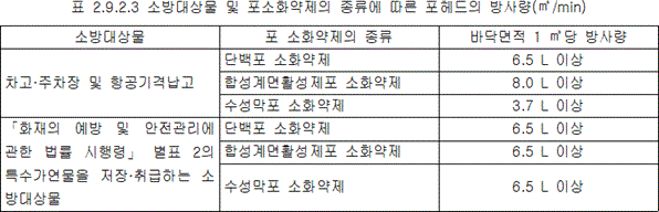 2.9.2 포헤드는 다음의 기준에 따라 설치해야 한다. 2.9.2.1 포워터스프링클러헤드는 특정소방대상물의 천장 또는 반자에 설치하되, 바닥면적 8 ㎡마다 1개 이상으로 하여 해당 방호대상물의 화재를 유효하게 소화할 수 있도록 할 것 2.9.2.2 포헤드는 특정소방대상물의 천장 또는 반자에 설치하되, 바닥면적 9 ㎡마다 1개 이상으로 하여 해당 방호대상물의 화재를 유효하게 소화할 수 있도록 할 것 2.9.2.3 포헤드는 특정소방대상물별로 그에 사용되는 포 소화약제에 따라 1분당 방사량이 다음 표 2.9.2.3 에 따른 양 이상이 되는 것으로 할 것